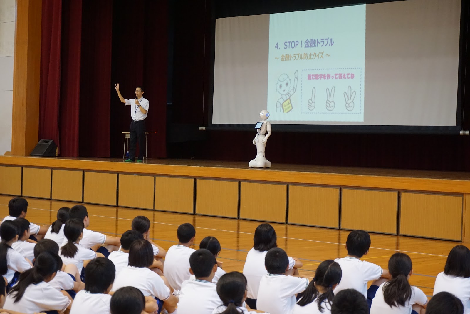 2017年8月愛知県にある田原中学校で、弊社開発Pepper製品「白い台本」を活用した、豊橋信用金庫主催の「金融出前授業」が行われました。